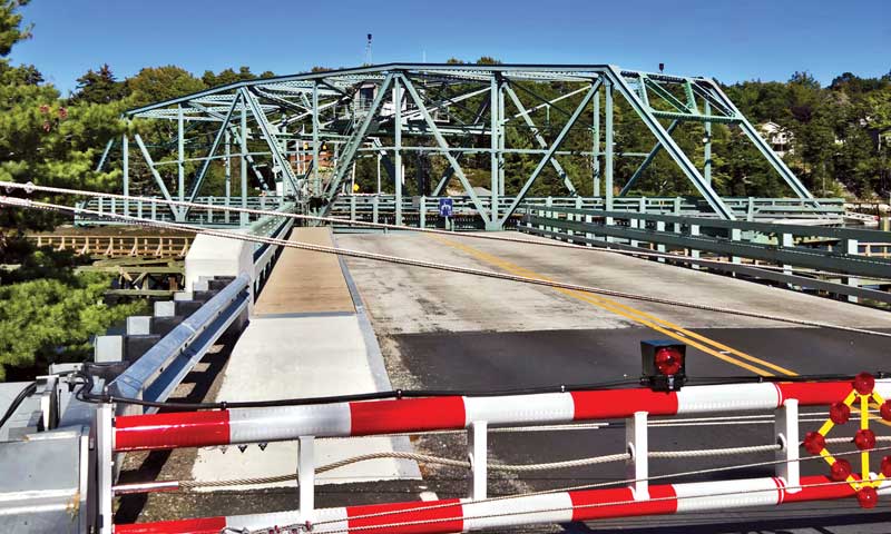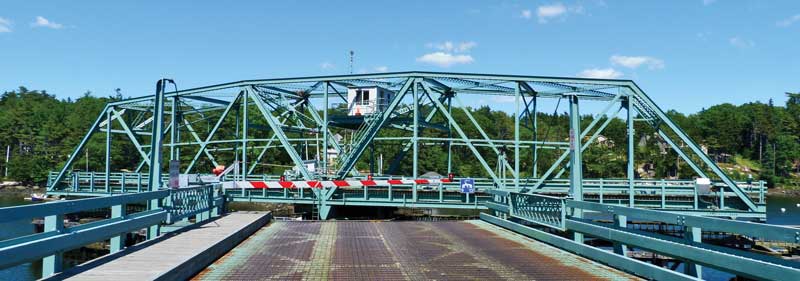 The classic swing bridge was completed in 1939 and today sees as many as 3,000 bridge openings a month in the busy summer season. The span opens on the half hour when hailed by boaters on VHF marine radio channel 09.