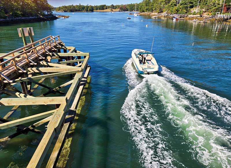Townsend Gut is a narrow, deep passage separating Boothbay from Southport Island. The waterway has long been crucial to navigation between the Sheepscot River and Boothbay Harbor by shaving 10 miles off the long run around Southport Island and Cape Newagen. Spanning the fabled gut, the Southport Island Swing Bridge carries Route 27 road traffic to and from the island while allowing vessels to transit through.