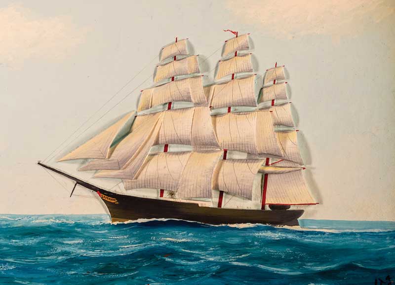 Over his lifetime—he died in 1990—Thomas carved and painted about 100 bas relief clipper ship panels, some of which are in the collections of the Maine Maritime Museum and Penobscot Marine Museum, and many are held in private collections. Several of Thomas’s grandchildren and a great grandson live in Midcoast Maine and own examples of his clipper ship panels, sea chests, and pineapples.