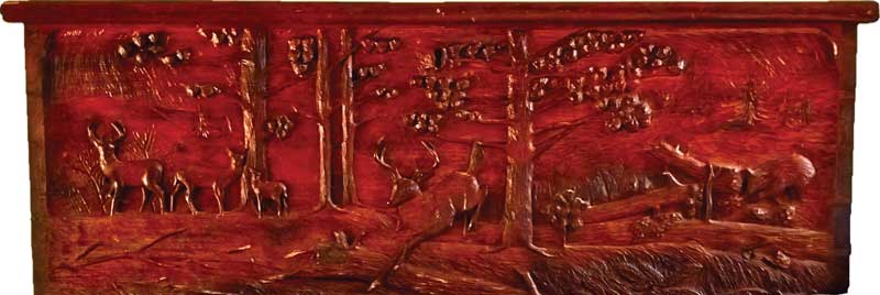 At about age 30, Thomas began carving seamen’s chests, mostly with sailing ships incised on the face, and often eagles sculpted into their tops. Occasionally, he carved deer and bear into surfaces of trunks to create woodland settings.