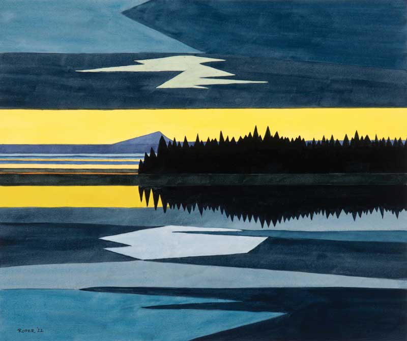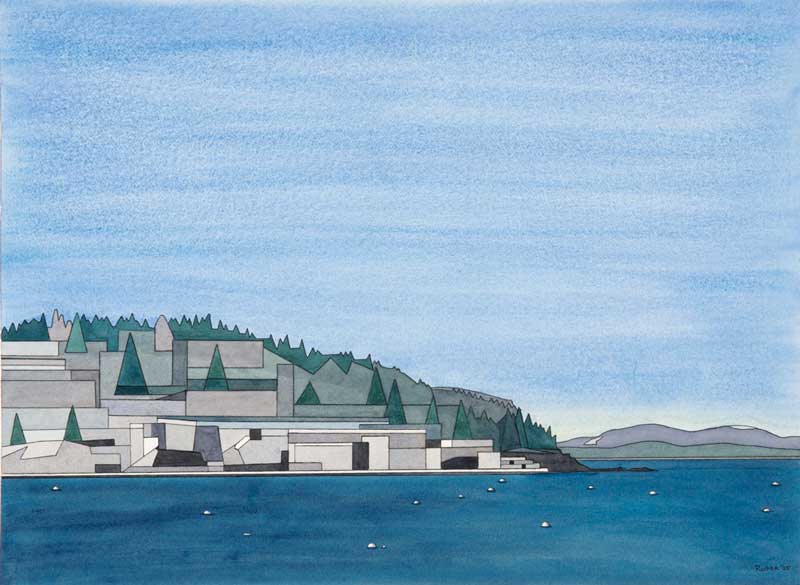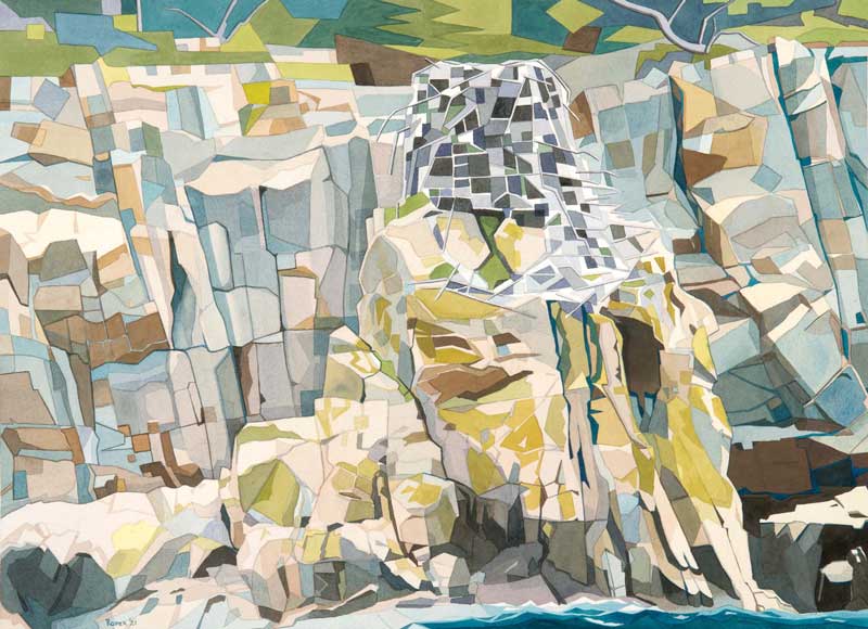 Last summer, McDowell was one of 40 or so artists invited to paint on Hurricane Island in Penobscot Bay. Hosted by the Hurricane Island Center for Science and Leadership as part of its “Convergence: Art Meets Science” initiative, she relished the opportunity to explore the former quarry island—and help support this educational enterprise. Her watercolor of a coastal prospect displays her signature geometricizing of the view, a passing storm rendered as bands of gray, the straight lines calming.