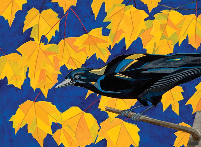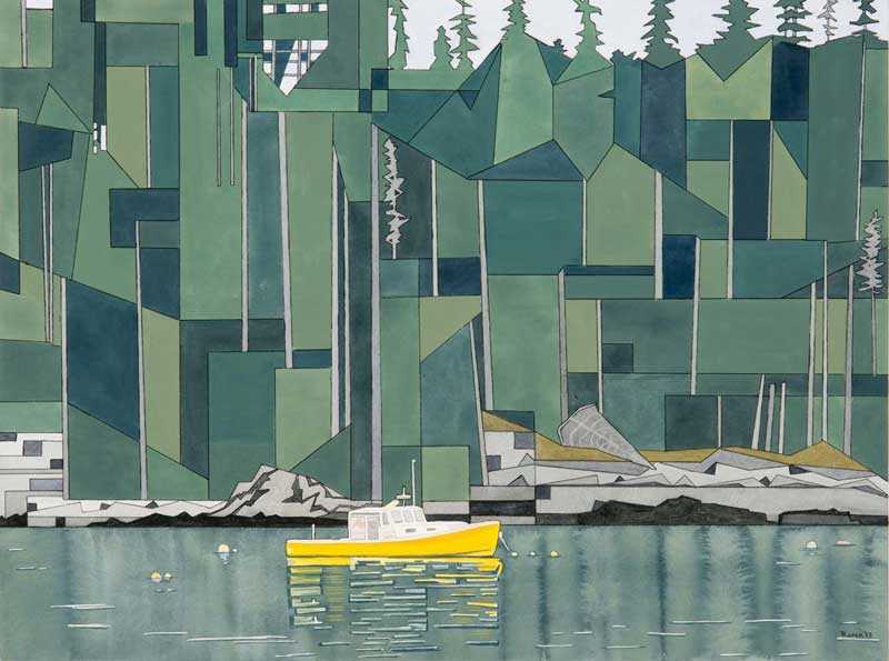 McDowell has favorite subjects, including the Asticou Azalea Gardens, which she paints nearly every year, and Little Long Pond. She also is an artist of animals—deer, bear, birds, etc.—each creature presented in striking geometric arrangements. And she has painted her share of vessels, from lobsterboats to schooners.