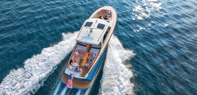 These days, however, Hinckley produces nothing but motoryachts, and is perhaps best known for a very specific type of craft: the Picnic Boat, a jet-driven, open-air express cruiser. Picnic Boats are easily recognized by their pillar curve—sometimes referred to as “the Hinckley swoop”—the arcing, subtle, trailing edge that defines the aft border of the coach-roof pillar that runs through the entire line.