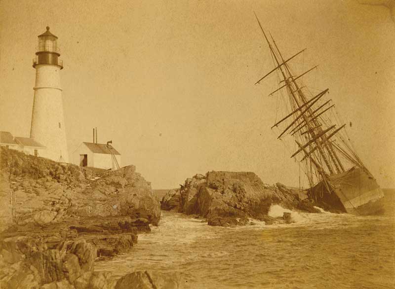 With that shocking announcement, the 1886 Christmas Eve festivities in Keeper Joshua Strout’s family quarters at Portland Head Light came to an abrupt halt. Incredibly, a British three-masted bark named the Annie C. Maguire had crashed onto a rocky outcropping a mere 100 feet from the 80-foot-tall tower on the edge of Cape Elizabeth. It’s thought a veil of blowing rain and snow may have caused the captain to misjudge his position just a few miles southeast of Portland harbor.