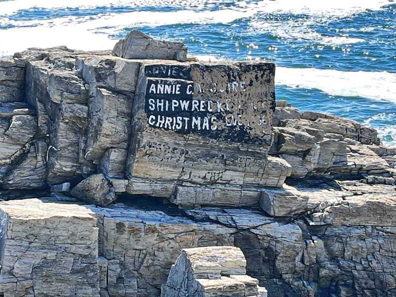 A simple bit of graffiti reminded me of the calamitous event when we visited the lighthouse in August, 2025. Painted in large white letters on a good-sized rock beside the tower, it read, “Annie C. Maguire shipwrecked here Christmas Eve 1886.” I later learned that Strout’s grandson, John, first put it there in 1912. It’s been renewed repeatedly ever since.