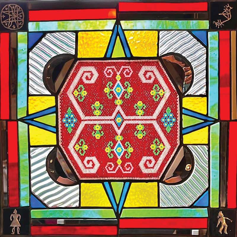 In the transition from beads to glass, Pictou began combining the two. One stained glass piece, Remember Who You Are, features a central beadwork square with a traditional double-curve Mi’kmaq motif. The four corners are Mi’kmaq petroglyphs from Nova Scotia where her family heritage begins.