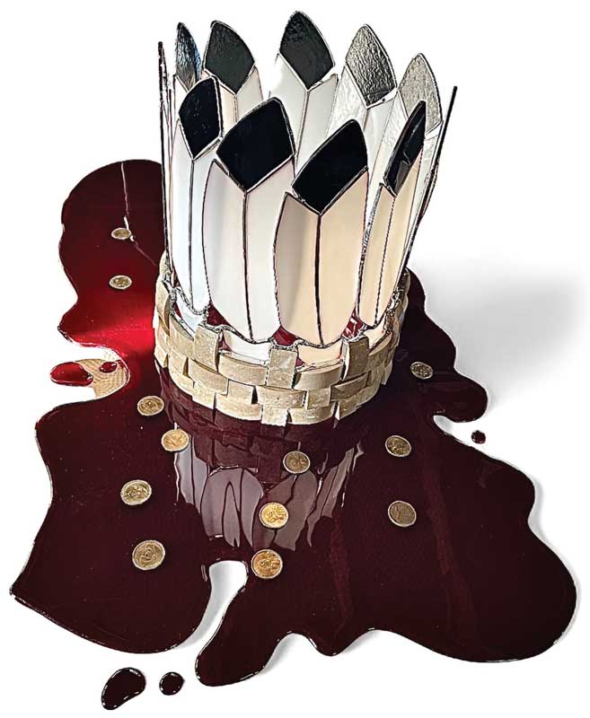 Pictou’s piece, The Price of Existing, is a traditional Mi’kmaq headdress made from glass and stone that rests on a pool of blood-red glass flecked with gold-colored coins. “It is a statement of unceded Mi’kmaq territory in a modern world and the price we had (and have) to pay for survival,” writes the artist, adding, “We are still bleeding, still being treated as non-human, and yet still surviving at a terrible cost.”