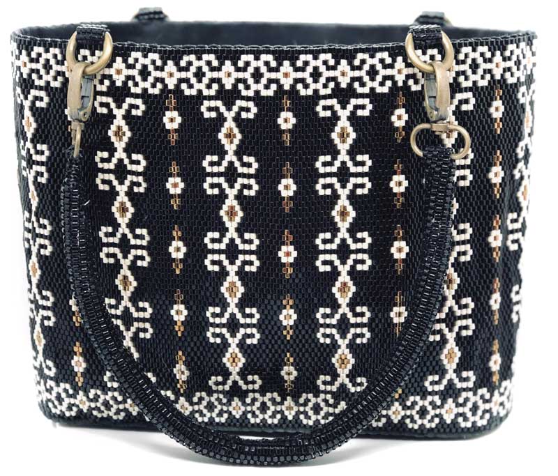 While she loves to learn the rules, Pictou also likes to test them. For a tote bag, she used large beads to create the structure. “It wasn’t beaded onto leather—the beads were the bag and then I sewed the leather onto them,” she explained.