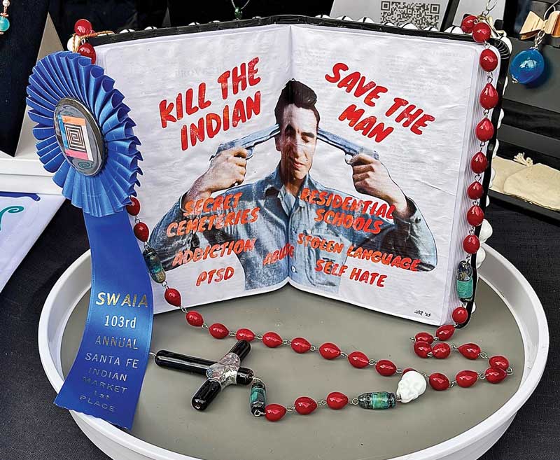 Pictou’s art often takes a confrontational turn. For the 103rd annual Santa Fe Indian Market last August, she showed Residential School Legacy: Blood, Bullets, and Lies, a mixed-media sculpture that represents her “Indigenous feminist rage” at what happened to her father—and, by extension, to her. Placed in the notorious Shubenacadie Indian Residential School in Nova Scotia, he experienced psychological and physical punishment at the hands of Bible-wielding staff and administrators, which led to life-long trauma. “They stole my father and my childhood,” she said.