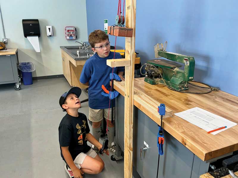 So, for instance, kindergarteners and first graders enjoy a “snowman” project, where they measure themselves using tape measures, cut two-by-fours to their heights with saws, and then paste noses on them that were created using a laser cutter. Older students design and make model boats. Or, in the welding shop, they might get a taste for metal fabrication.