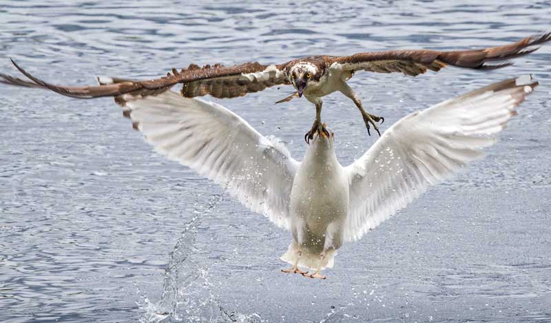 Lowe thrives on difficult-to-shoot images: an osprey diving at 50 mph just as it hits the water, gulls locked in aerial combat fighting over a single alewife, a mother loon feeding her chick a crayfish, a piping plover mid-flight and silhouetted against a fading sunset.
