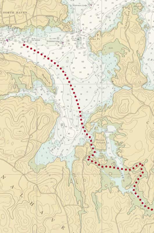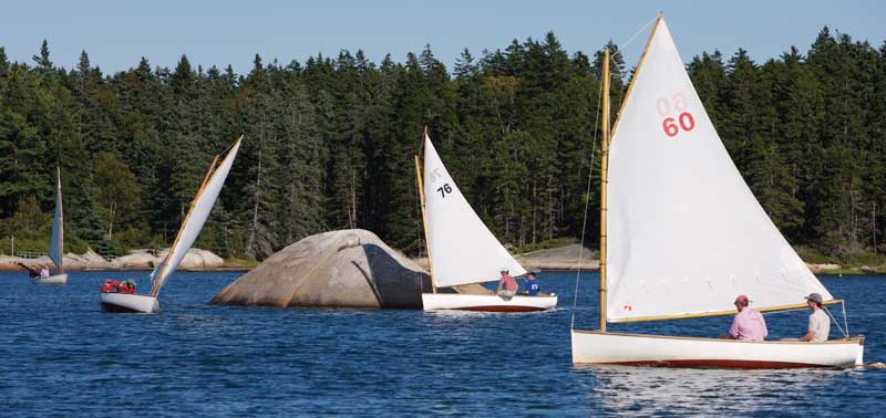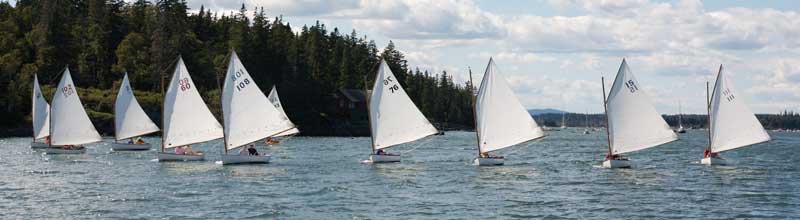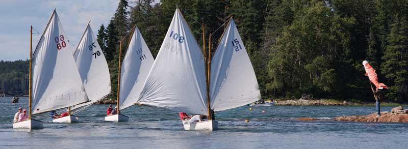Each summer on a day when the tide peaks in the mid afternoon, North Haven Dinghies race down the Fox Islands Thoroughfare, up Vinalhaven’s Seal Cove, and into an inner basin known as Mill River. They wind their way around various islands and rocks, round a mark at the head of the basin, and race back, finishing in the Thoroughfare in front of the North Haven yacht club, known locally as the Casino.