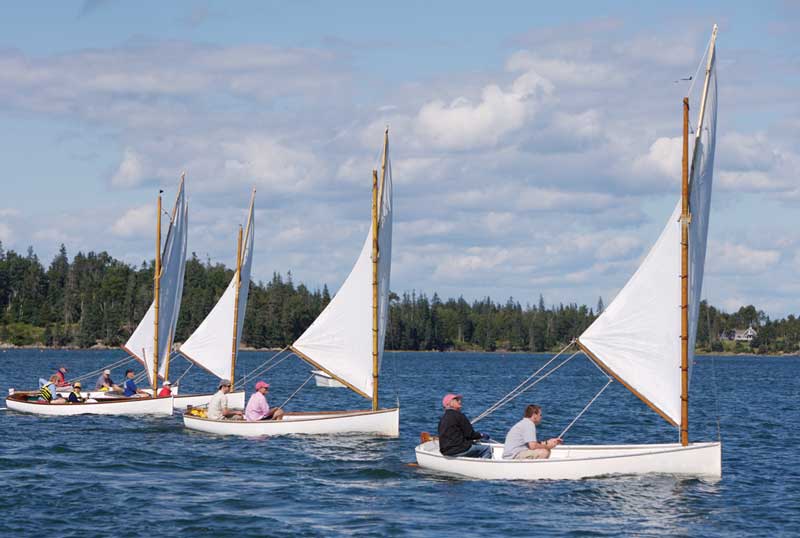 Those first four boats began racing in 1885, according to an early account by Tucker Daland, one of the summer colony’s founders and owner of one of the four new boats. The design was modified from a spritsail to a gaff rig with the mast set in the eyes of the boat. The first “official” race of the modified boats took place in August 1887. The dates are important, because the Water Wags of Dublin, Ireland, also began racing in 1887, in April. Some argue that this makes the Water Wag the world’s oldest one-design, but others note that North Haven began racing a version of its dinghy in 1885, even though the design was later modified.