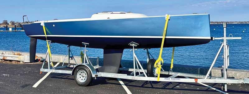 Although heavily ballasted to provide sound footing under sail and while on a mooring, the J/7 can also live in a backyard for free and be easily transported and launched. In terms of size and weight, it was designed to be trailerable, as they say, “behind the average SUV.” Unlike many comparable boats, the mast is deck-stepped, which makes it possible for the young and strong at least to step the spar by hand, without the delay and expense of a crane or gin pole. In consideration of dry-sailing, where boats are launched by a crane for the race and pulled immediately afterward, there is a single lifting point on the hull located at the center of gravity—so no slings are needed.