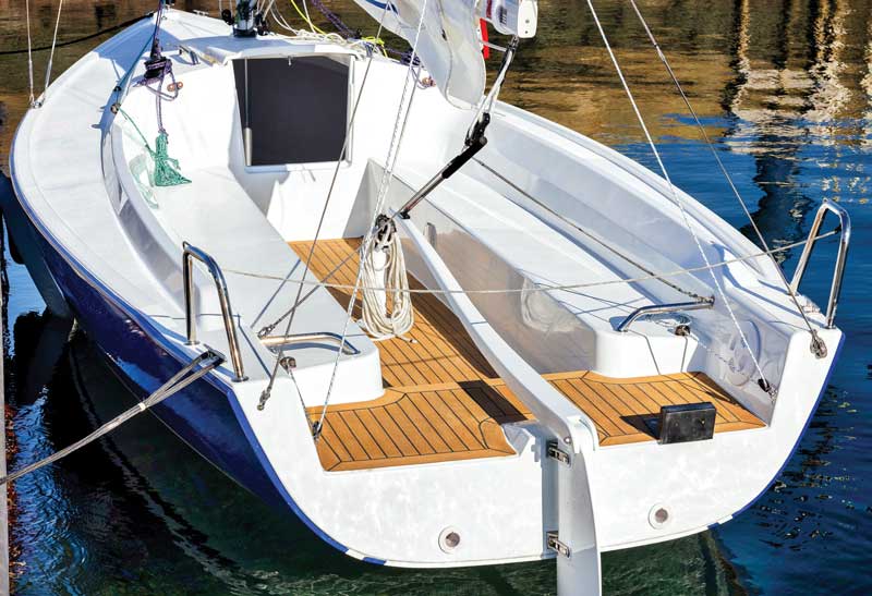 The cockpit, with a faux-teak sole, is large and has comfortable seating both inboard (with comfy slanted seatbacks) and out on the side decks. Both for performance and safety, this keelboat has been designed around exceptional stability, so crews won’t need to hike out nearly as much as in other “sport” daysailers. Those side decks I mentioned are nearly 9 feet long. This accommodates four or five adults. If racing’s your desire, you could shanghai a phalanx of brutes. I can only imagine how fast the boat would be with that moveable ballast when tacking into a stiff sou’wester.