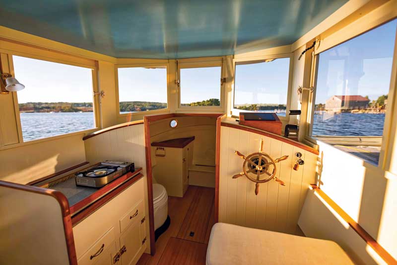 The team at Hylan & Brown gutted the whale boat down to its bare hull and built a whole new superstructure, including a hard-top cabin with spartan accommodations. Two settees extend into sleeping berths. Additional features include a black cherry table, doors, and trim, a tiny head, and a single-burner stovetop that folds up to reveal a sink underneath.