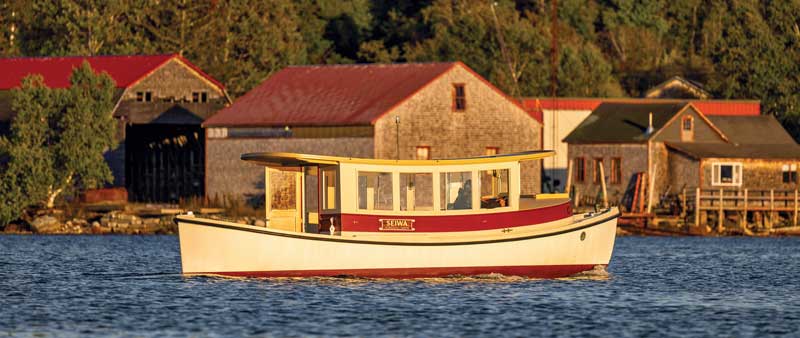The team at the Brooklin, Maine, yard turned a vintage, double-ended Navy whaleboat into a sleek cabin cruiser that’s fully powered by electric motors and solar panels. Named Seiwa, the vessel cruises at about 4 knots; and if the sun is shining, the solar panels in combination with the batteries enable the boat to cruise all day without plugging in to shoreside power.