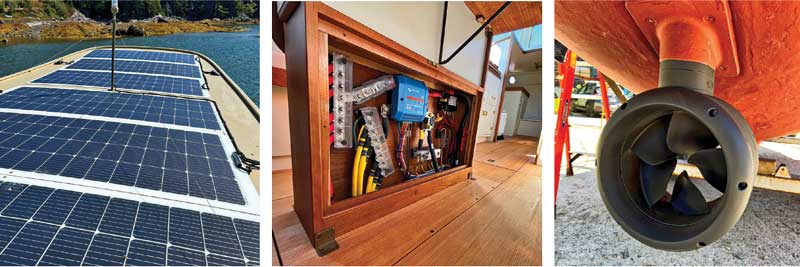 Power comes from a 60-kilowatt power bank consisting of 12 Victron 24-volt, 200-amp batteries stored under the settees. The motor is a 15-kilowatt, seal-less, completely waterproof pod drive built by Holland-based Rim Drive Technologies. It looks like a sort of nozzle or ducted propeller, but the blades of the propeller point in toward the center, with the rotor of the motor surrounding them, according to Ben Parson, the Hylan & Brown employee who helped design the system.