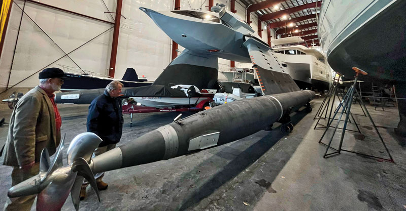 Over the next couple of hours, we visited a machine shop, a wood shop, paint bays, a rigging loft, and still more sheds packed with boats. Here, we spotted a Pearson Ensign, there a Portland fire boat. There were bass-fishing boats, an employee’s snowmobile in for fine tuning, outboard engines, pontoon boats. In one bay near the water, we found a massive prototype of an autonomous craft designed to be used as a gun platform to protect a naval fleet. What in heck was that doing there? Right behind it was a French power trimaran in for structural repairs.